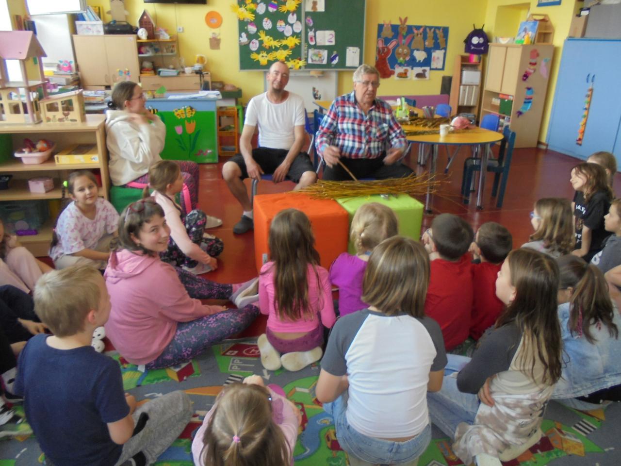 Velikonoční hry, velikonoční omalovánky a návštěva mistrů Padevětových s tradiční výukou pletení pomlázek ! Už umíme uplést sami pomlázku:o))))