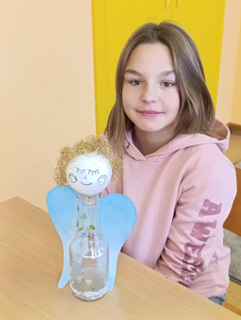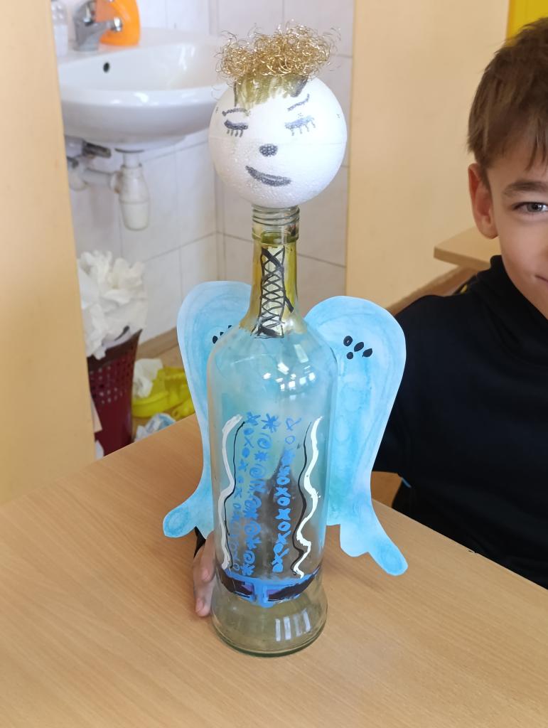 Žáci vytváří andělíčky z láhve. Myslím si, že se jim to moc povedlo.