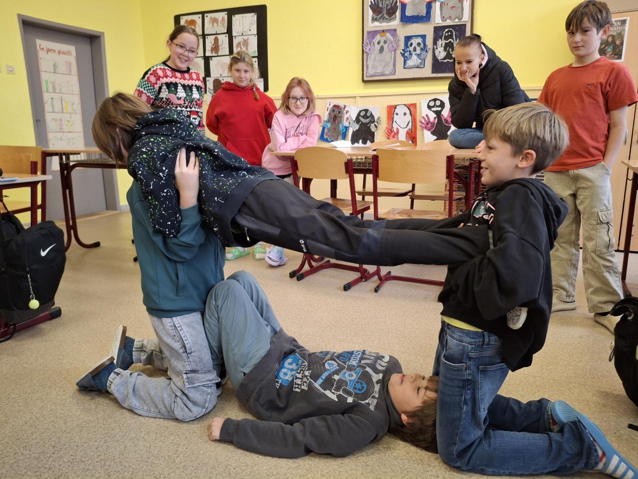 Téma mnohoúhelníků jsme pojali jako pohybovou hru. Děti ze sebe tvořily různé mnohoúhelníky, poté jsme procvičovali obrazce s pomocí hůlek. Děti si tak mohly rovinné útvary osahat.