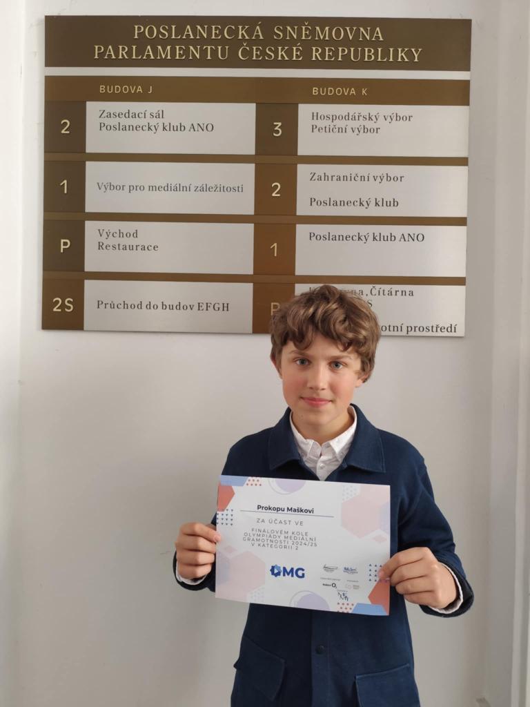 V pátek 23. května se v Praze konalo celorepublikové finále soutěže Olympiáda mediální gramotnosti. K naší velké radosti se ho zúčastnil jeden z našich žáků, Prokop Mašek ze sedmé třídy. Probojoval se mezi třicet nejlepších, a to z nemalé konkurence. Základního kola se zúčastnilo na třicet tisíc žáků z celé republiky. Mezi top pět studentů se již sice postoupit nepodařilo, i tak jsme na Prokopa právem hrdí a srdečně mu gratulujeme. Užil si nejen perfektní atmosféru mezi ostatními soutěžícími, ale také kouzlo reprezentativních prostor. Celá soutěž se totiž konala v Poslanecké sněmovně Parlamentu České republiky.